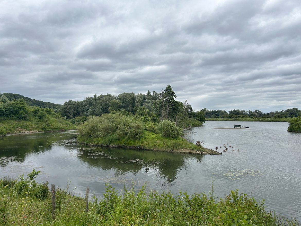 Na de overtocht (zoals je ziet onder zeer verantwoorde begeleiding) volgen we de Maas. De natuur hier verbaast ons, als we niet tussen de mooie bebossing lopen, zien we een paar mooie zijtakken van de hoofdrivier. Hier zou zelfs de bever moeten zitten, maar wij hebben niet het geluk gehad die te mogen spotten.